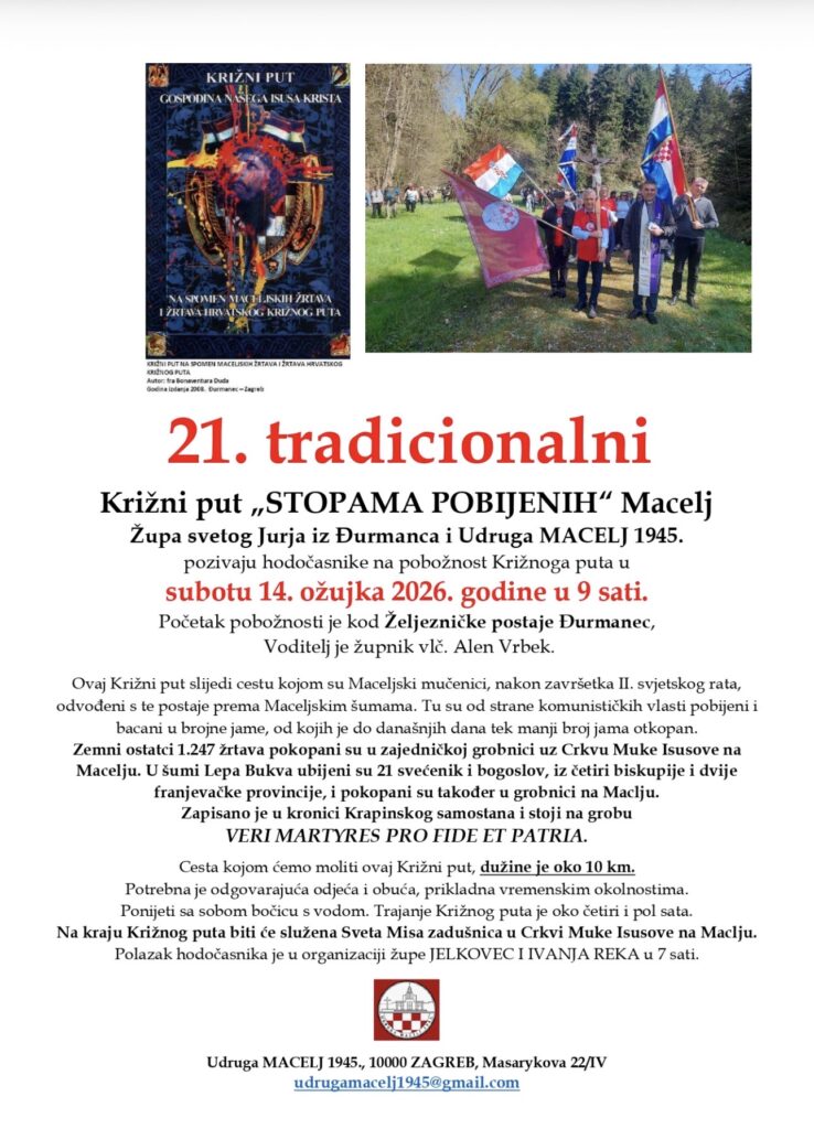 Pozivamo vas na 21. KRIŽNI PUT – STOPAMA POBIJENIH, koji će biti u subotu, 14. ožujka, s početkom u 9 sati sa željezničke postaje u Đurmancu, a završava svetom misom u crkvi Muke Isusove u Maclju.